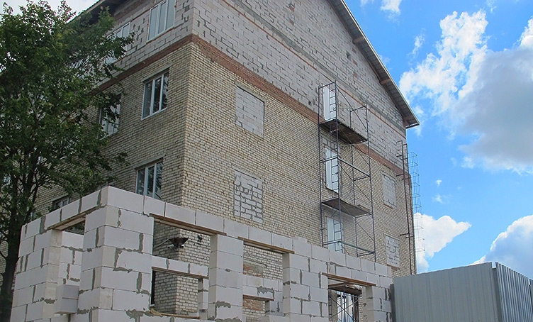 Реконструкция здания общежития для рабочих 4 000 м2. г. Русино. Для ООО «ТехноКапитал» Надстройка 4-го этажа, отделка помещений монтаж внутренних и наружных инженерных сетей, благоустройство.
